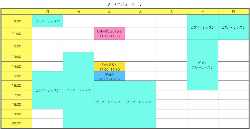 | Step5 | 2020年4月~2021年3月生まれ | 【kids day】を中心にレッスン致します。Step5はピアノの導入レッスンも少し致します。 |